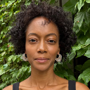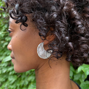 The Viviane hoop earrings are handcrafted from repurposed 1950s Chantilly lace, cut into the shape of a crescent moon. Each pair is unique, as every earring is formed from a different part of the lace. Covered in shimmering sterling silver, they are lightweight and easy to wear, making them perfect from day to evening.