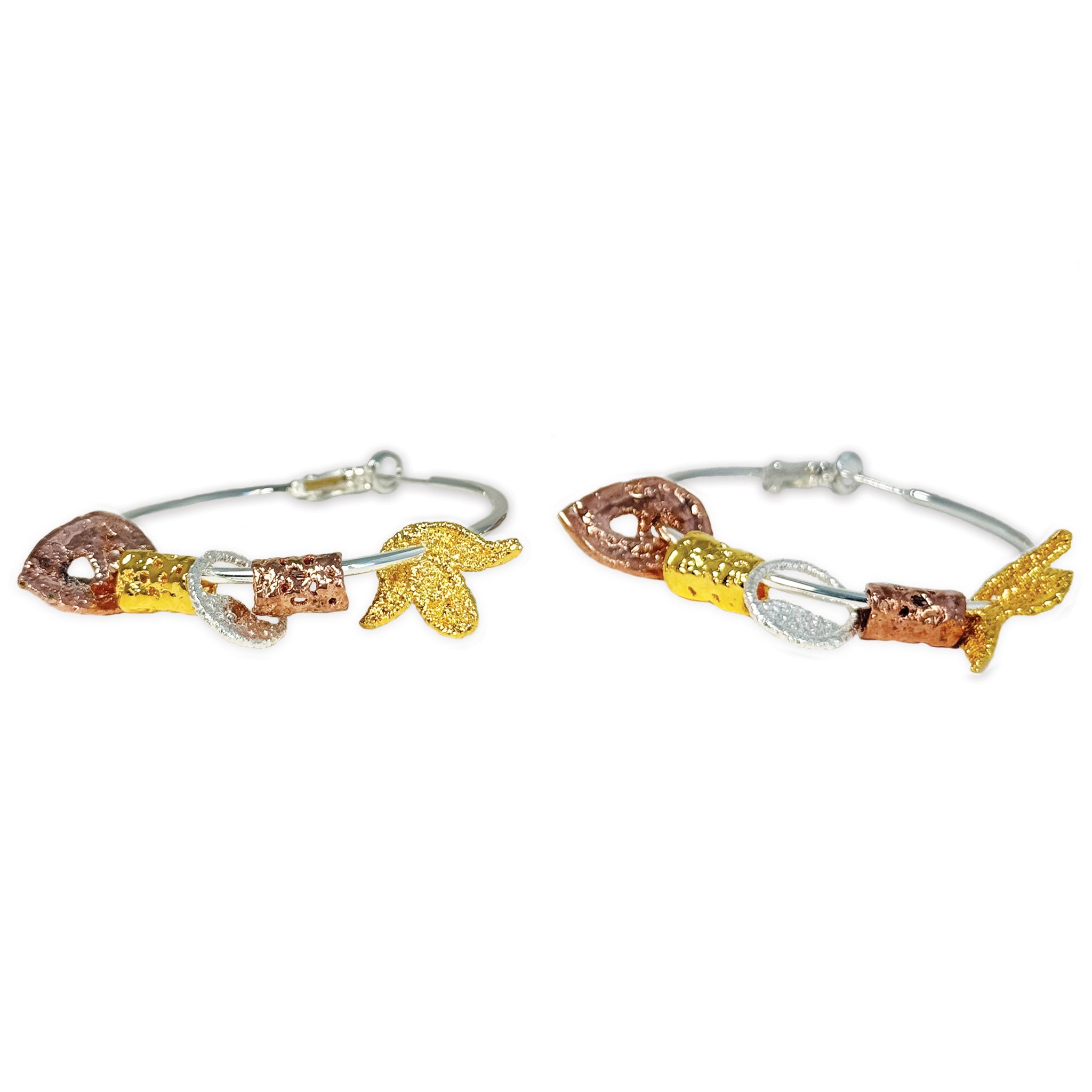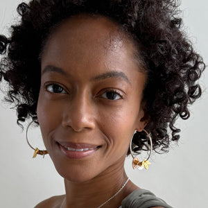 The Osanna hoop earrings are inspired by the elegant dress designs of Carmen Fiol in Havana. Lightweight and comfortable at 2 inches, each sterling silver hoop is adorned with delicate lace charms dipped in 24k gold, rose gold, and sterling silver.